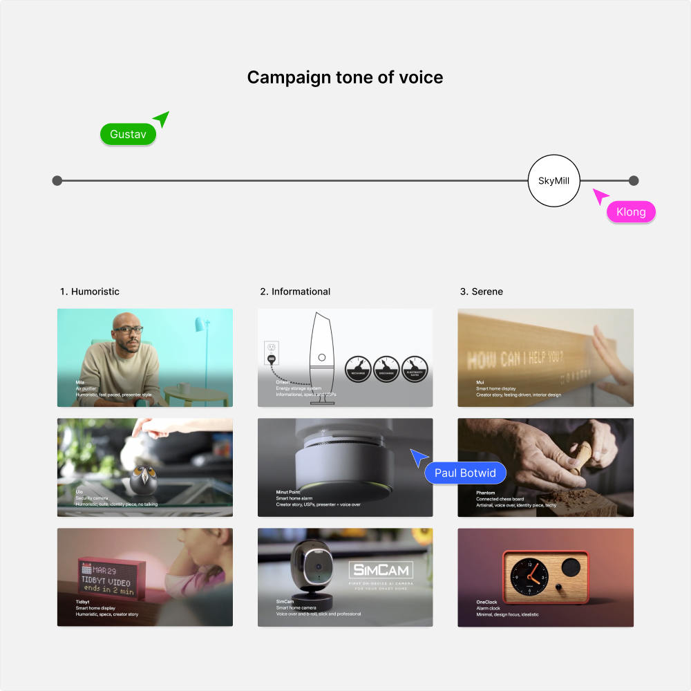 During a workshop with the client, I presented them with three different common styles of tone of voice when making Kickstarter campaigns.