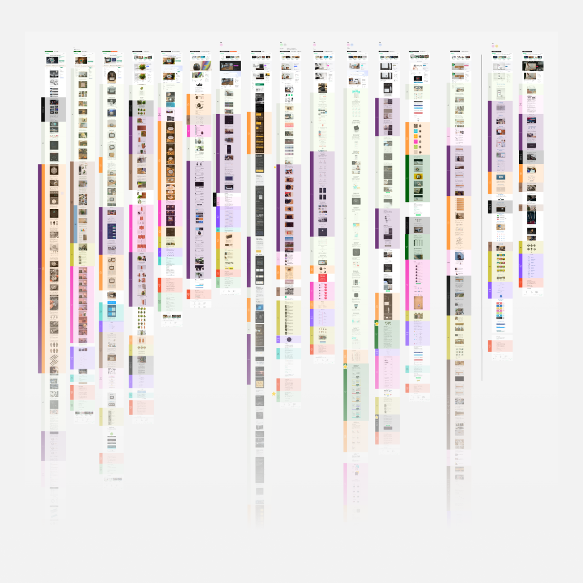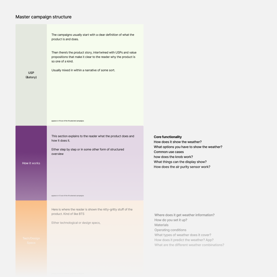Analysis of 15+ Kickstarter campaigns. Each column is an analyzed campaign. The structures were color coded to distill repeated sections in successful campaigns.
