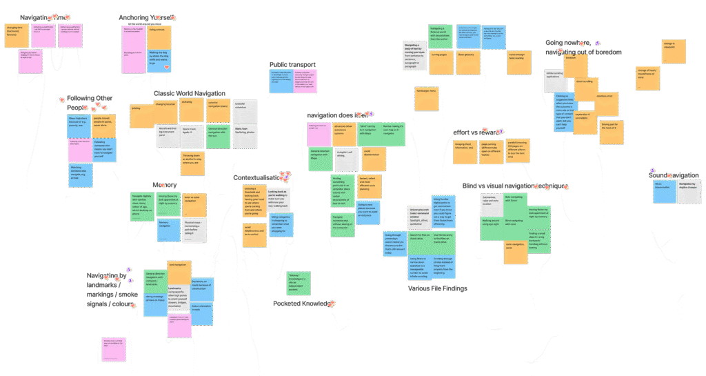 Initial exploration session. Early in the project, we explored metaphors and mental models of navigation — from seafaring and GPS to memory, autopilot, and social behaviors — to broaden our understanding of how people move through digital spaces.