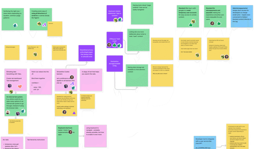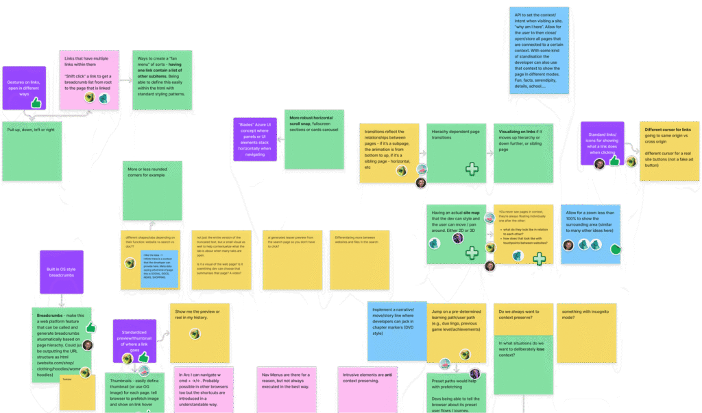 Our initial explorations missed the mark. They focused too much on the browser itself – tab grouping, history visualizations, and extensions. After early feedback, we shifted focus and framed new ideation around a set of “how might we” questions aimed more squarely at empowering developers.